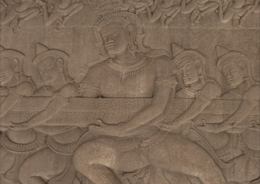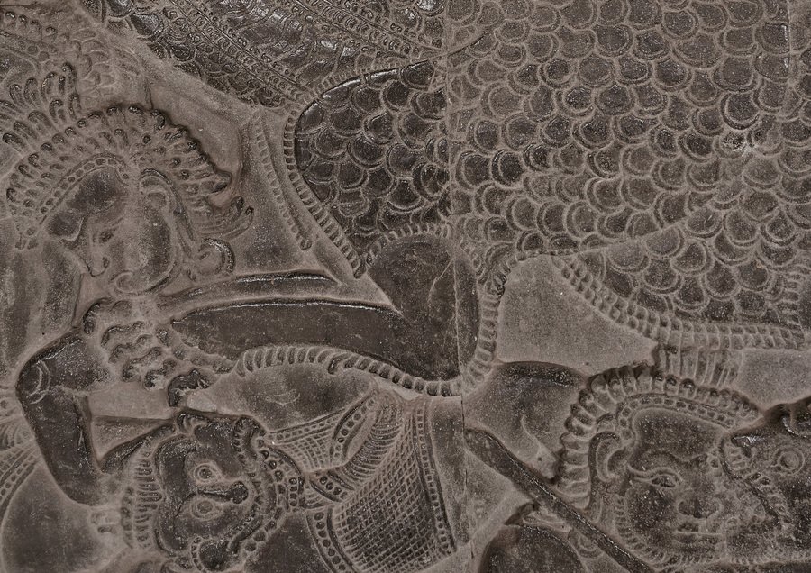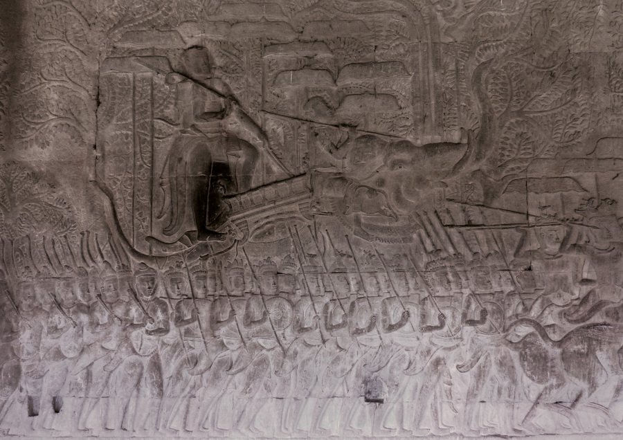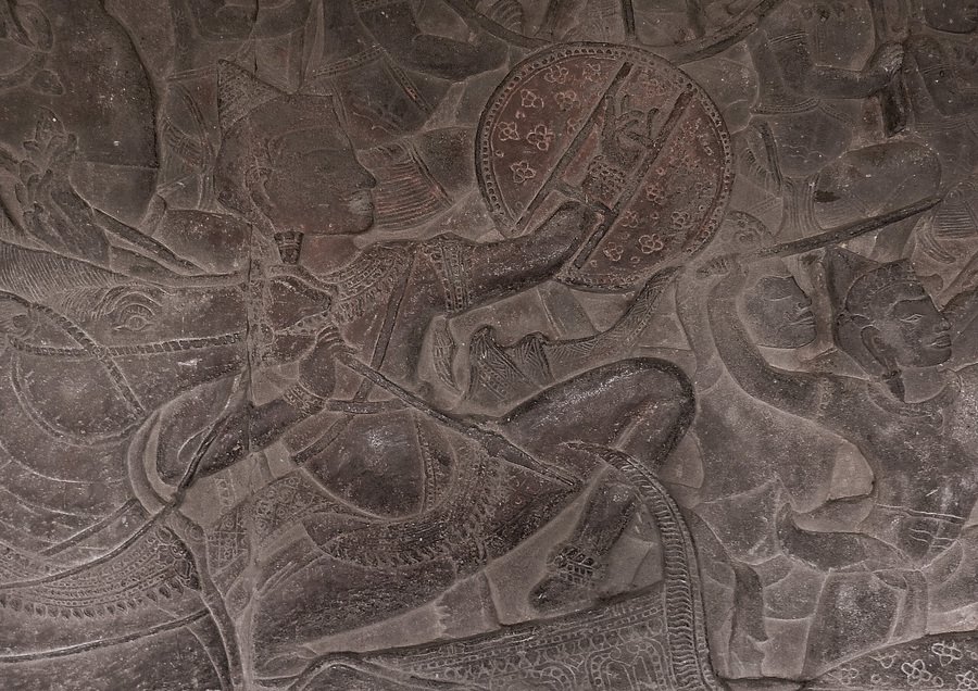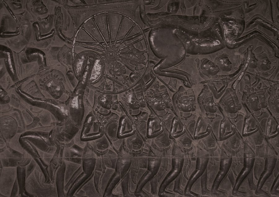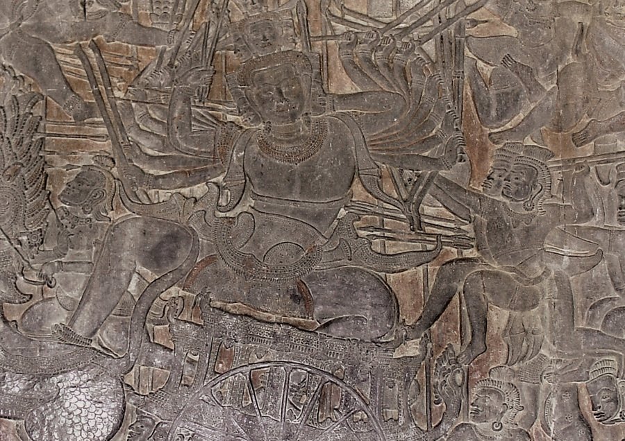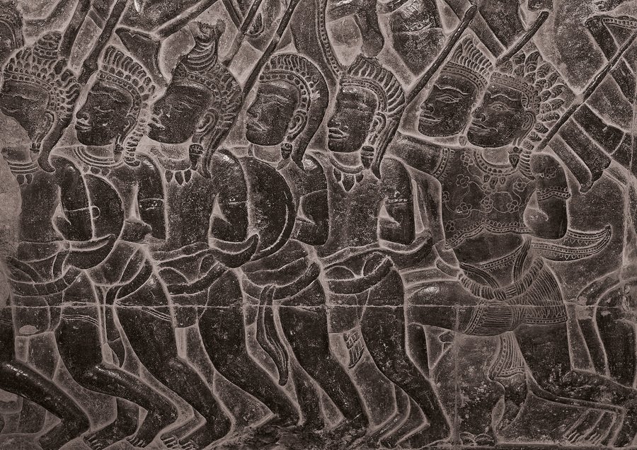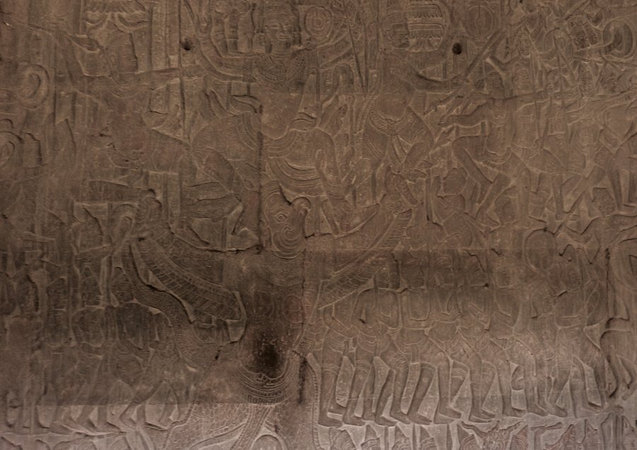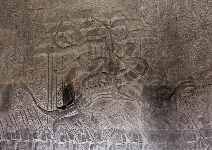 Этот барельеф Ангкор-Вата иллюстрирует один из ключевых эпизодов древнеиндийского эпоса «Махабхарата». Композиция разделена на два яруса, что символизирует противостояние двух армий.