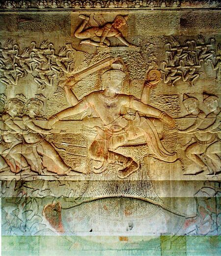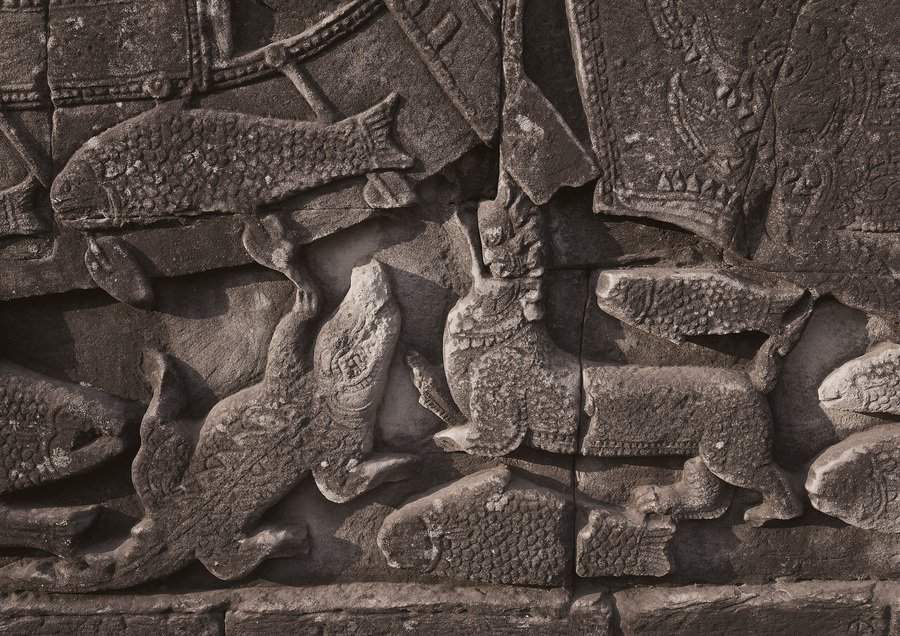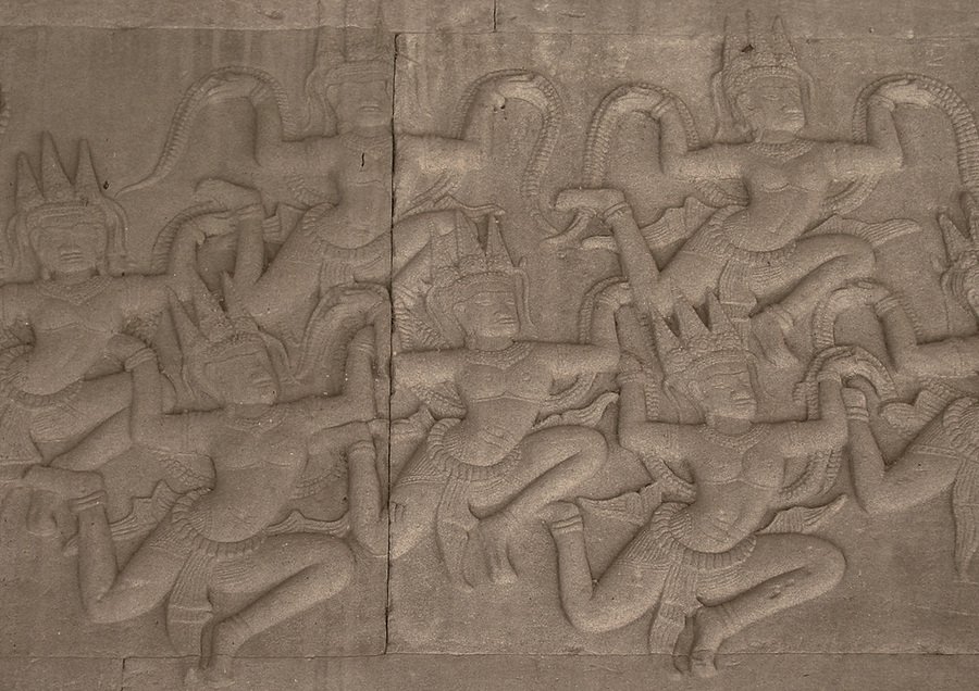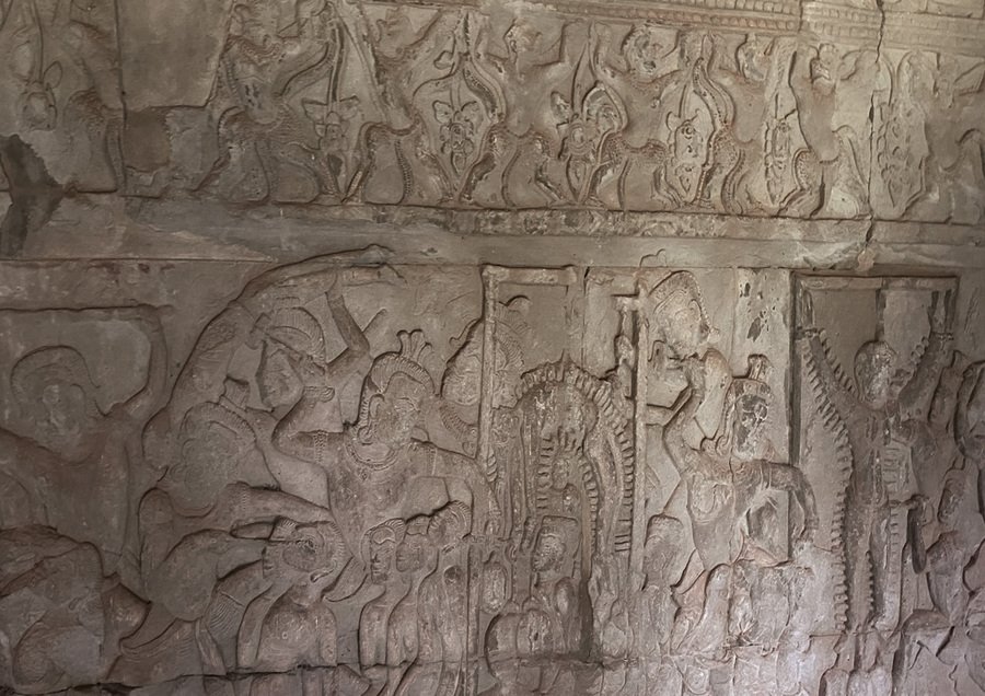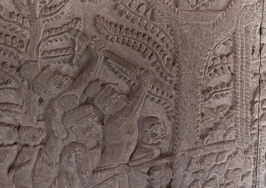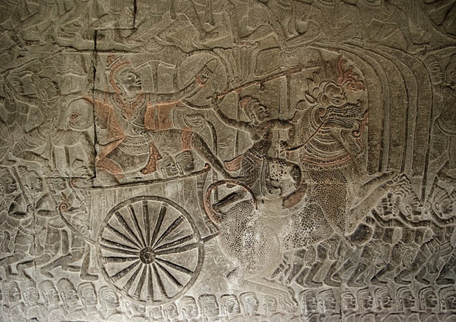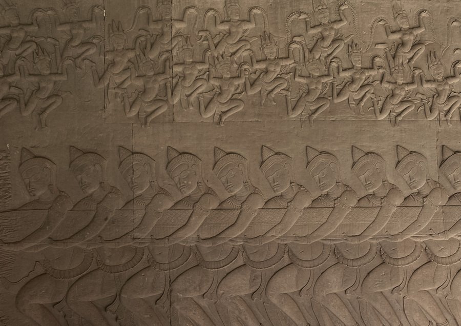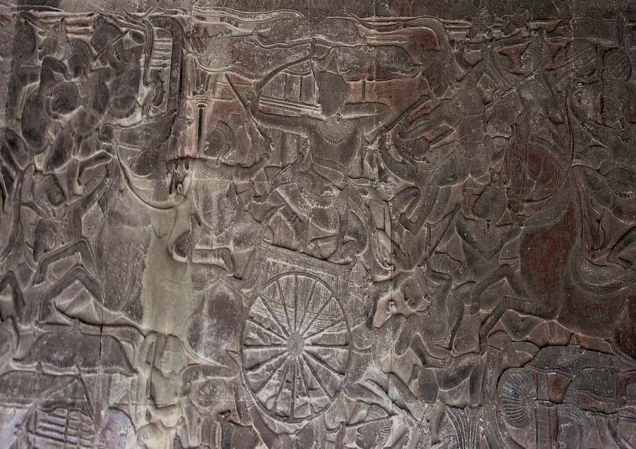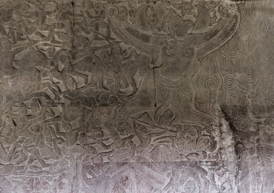 Этот барельеф Ангкор-Вата иллюстрирует один из ключевых эпизодов древнеиндийского эпоса «Махабхарата». Композиция разделена на два яруса, что символизирует противостояние двух армий.