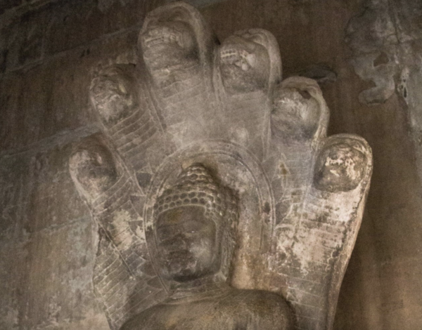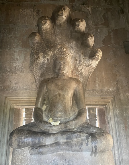 Статуя Будды под покровом семиглавого нага в Ангкор-Вате изображает ключевой эпизод жизни Просветлённого — защиту царя змеев Мучалинды во время медитации. Символика композиции многогранна: Нага олицетворяет защиту дхармы и связь с хтоническими силами; Поза медитации Будды символизирует непоколебимость просветленного ума; Семь голов змея могут трактоваться как семь направлений пространства или семь ступеней познания.