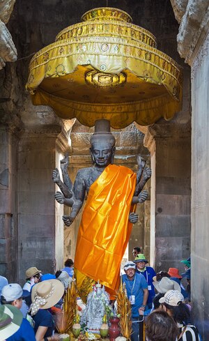 Несмотря на изображение Вишну, буддисты, посещающие храм, продолжают уважать его.Такой религиозный синкретизм характерен для региона и отражает многослойное культурное наследие Ангкор-Вата.