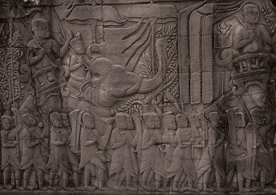 Барельеф с военной процессией Сурьявармана II в отличие от других рельефов Ангкор-Вата, изображает не мифологические сюжеты, а реальную историческую сцену из жизни кхмерской империи.