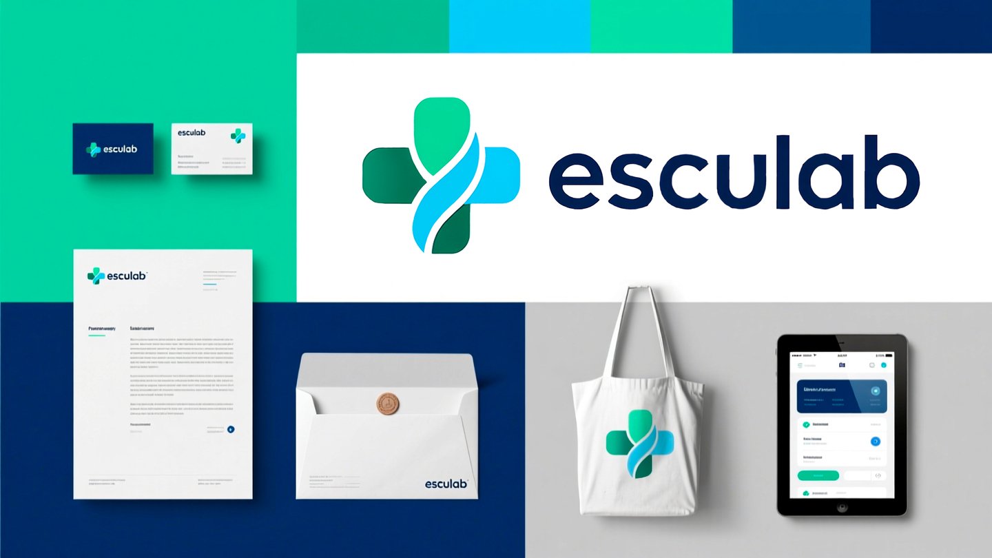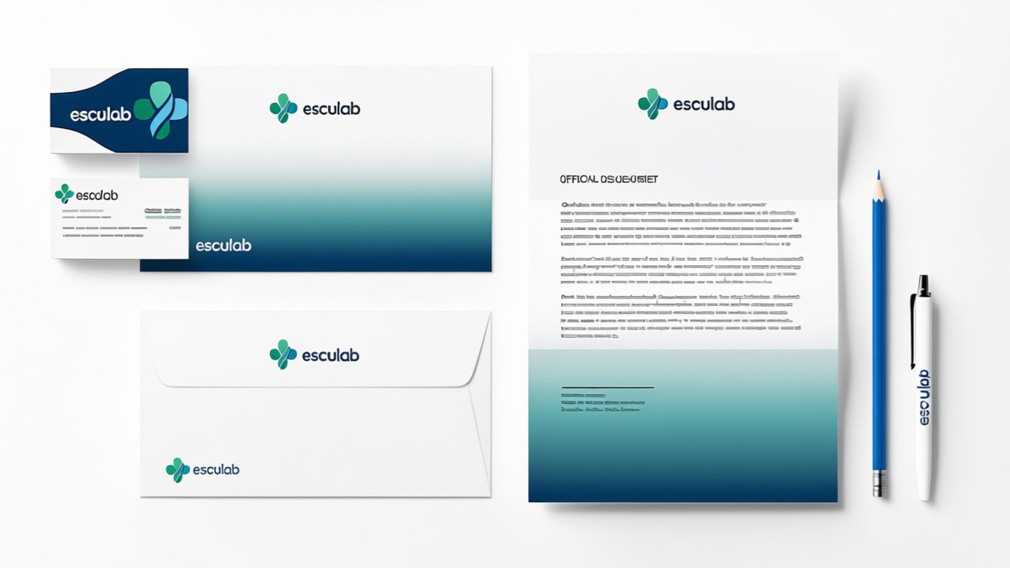 /promt: Create a clean, modern corporate identity layout for the medical company esculab. Use the official logo: a curved, elongated medical cross symbol on the left in green and light blue colors with a smooth transition in the center, combined with the word esculab written in lowercase letters in a rounded geometric font without serifs. Нейросеть: Qwen