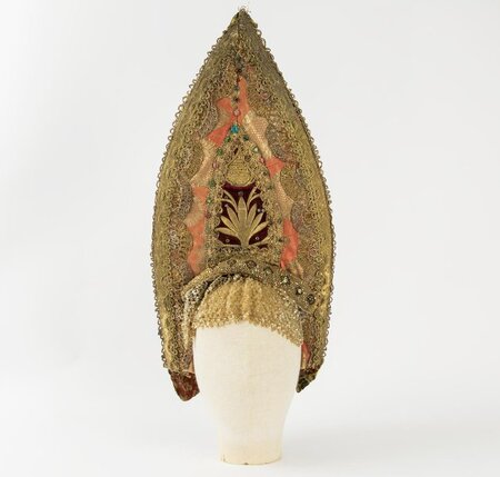 1. Кокошник. Владим. губ. XVIII в. Холст (льняной), парча (глазет), позумент, нити металлические, фольга. 2. Кокошник. Ярослав. губ. XVIII в. — перв. пол. XIX в. Ткань шелковая. РЭМ