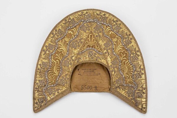 Иллюстрация: Головной убор «Повязка». Калужская губерния. втор. треть XIX в. Холст, штоф, кумач, перламутр, нити золотные, блёстки металлические, стекло.