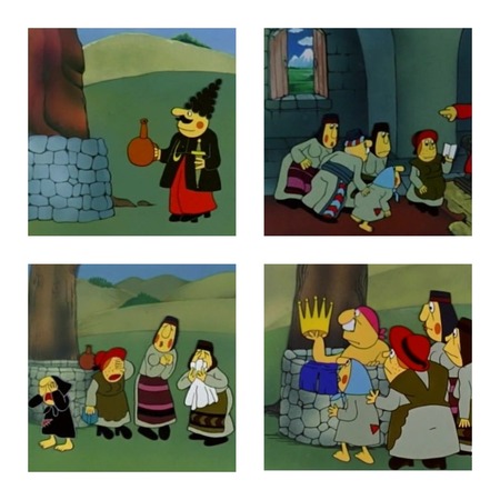 И все же возможно увидеть хотя бы некоторые элементы одежды, характерные для грузинского народа в мультфильме «Снова о драконе и витязе» (1976) режиссера Мераба Саралидзе.