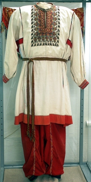 Позднее в мужской крестьянской одежде появился другой вид поясной одежды — брюки, которые вошли в быт во второй половине XIX века. Поскольку брюки пришли из городской среды, в деревнях их считали признаком модничества. Поэтому чаще всего их надевали как часть праздничного наряда молодые мужчины и парни.