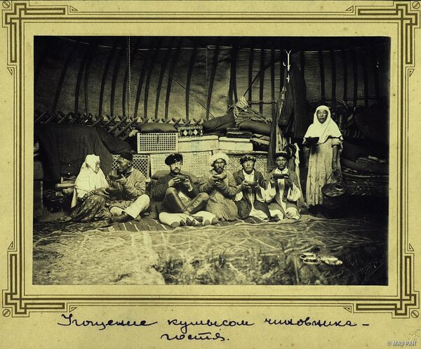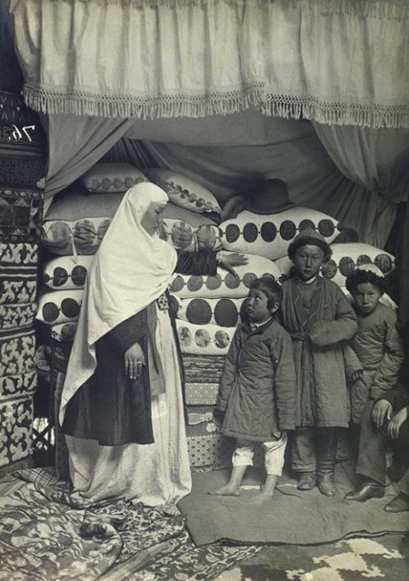 1. Богатая женщина с детьми, 1899 г., фотография Самуила Дудина 2. Угощение казахами чиновника-гостя в юрте. Казахи. Казахстан, Акмолинская область, Кокчетавский уезд). 1897