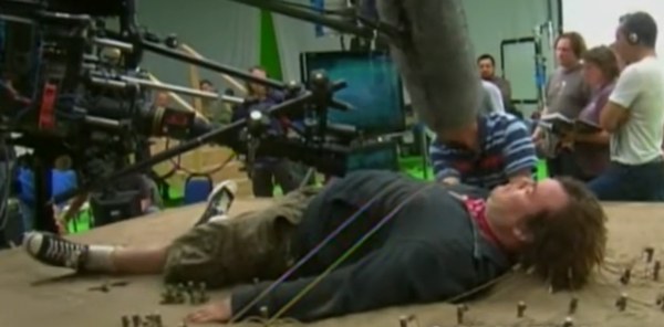 Кадр со съемок и кадр из фильма «Приключения Гулливера», 2010