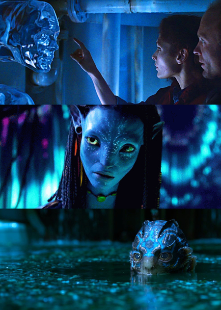 3. Использование разных технологий создания, в том числе совмещение: практические эффекты, цифровая графика, дополнение гримом. «Бездна» как пример передовых практических эффектов и раннего использования компьютерной графики для спецэффектов, «Аватар» — это прорыв в производстве фотореалистичных существ через захват движения, виртуальную киноплощадку и масштабный CGI, «Форма воды» — сочетание практических костюмов и грима и цифровой графики, акцент на органике и действиях персонажа.