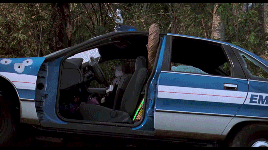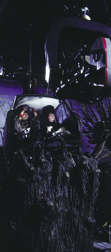 Автомобиль крепился к стволу болтами, чтобы он мог безопасно раскачиваться взад и вперед вместе с людьми внутри. Управление осуществлялось при помощи специальной системы, передающей движение миниатюрных моделей на полноразмерные элементы, а при необходимости движения программировались через компьютер. Все крупные взаимодействия между автомобилем и деревом снимались практически, чтобы сохранить правдоподобную физику ударов. А точность, контролируемая компьютером, обеспечивала безопасность актерам, находившимся внутри.