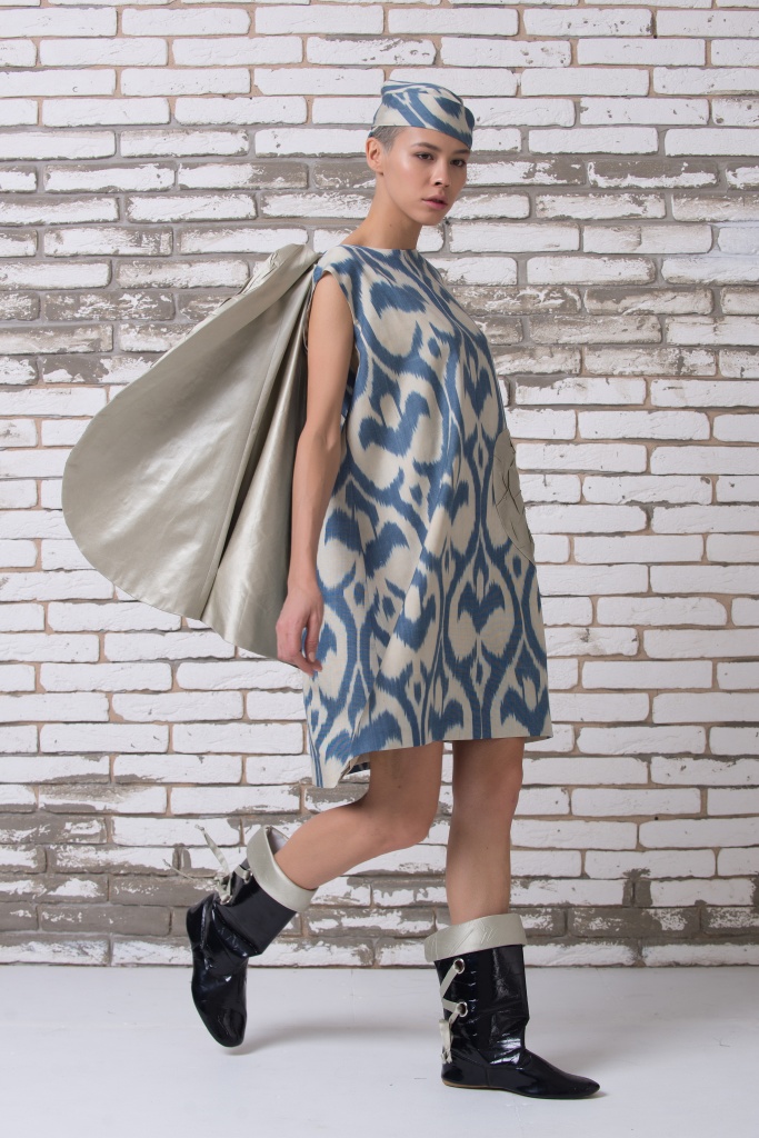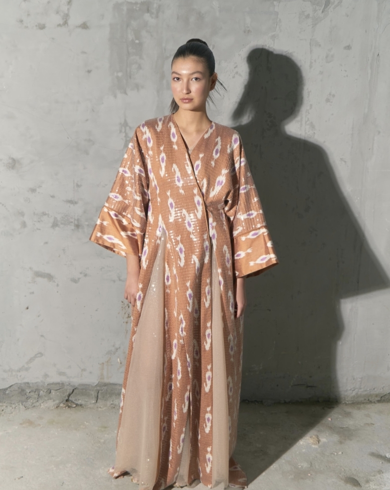 Платье, вдохновлённое традиционным узбекским мурсаком (женским верхним халатом) из ткани адрас. Работа Дильнозы Умирзаковой — основателя бренда AnorCouture