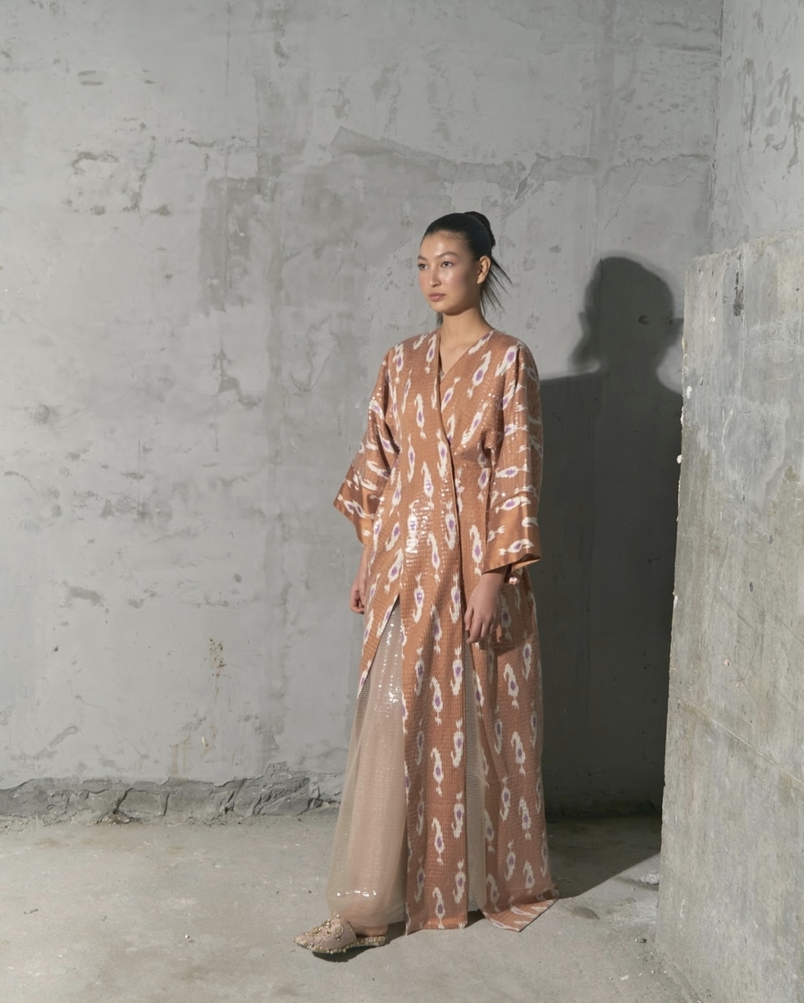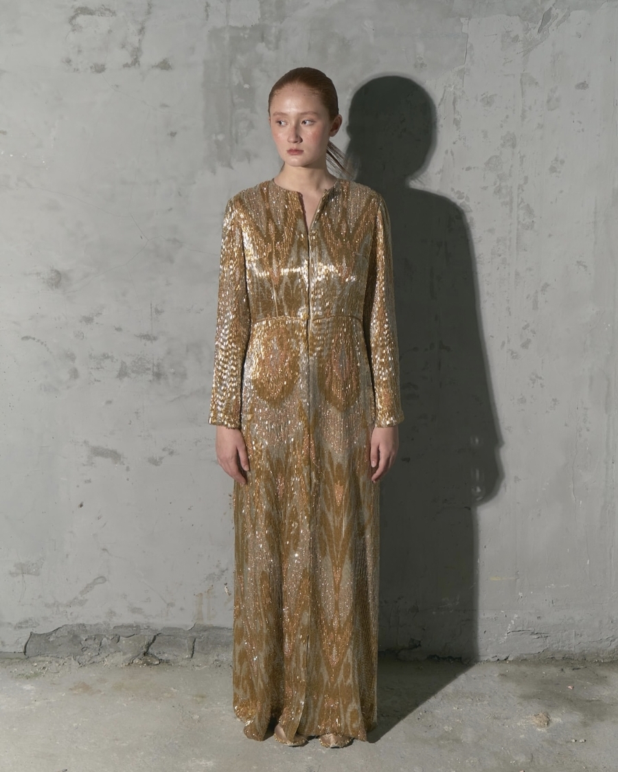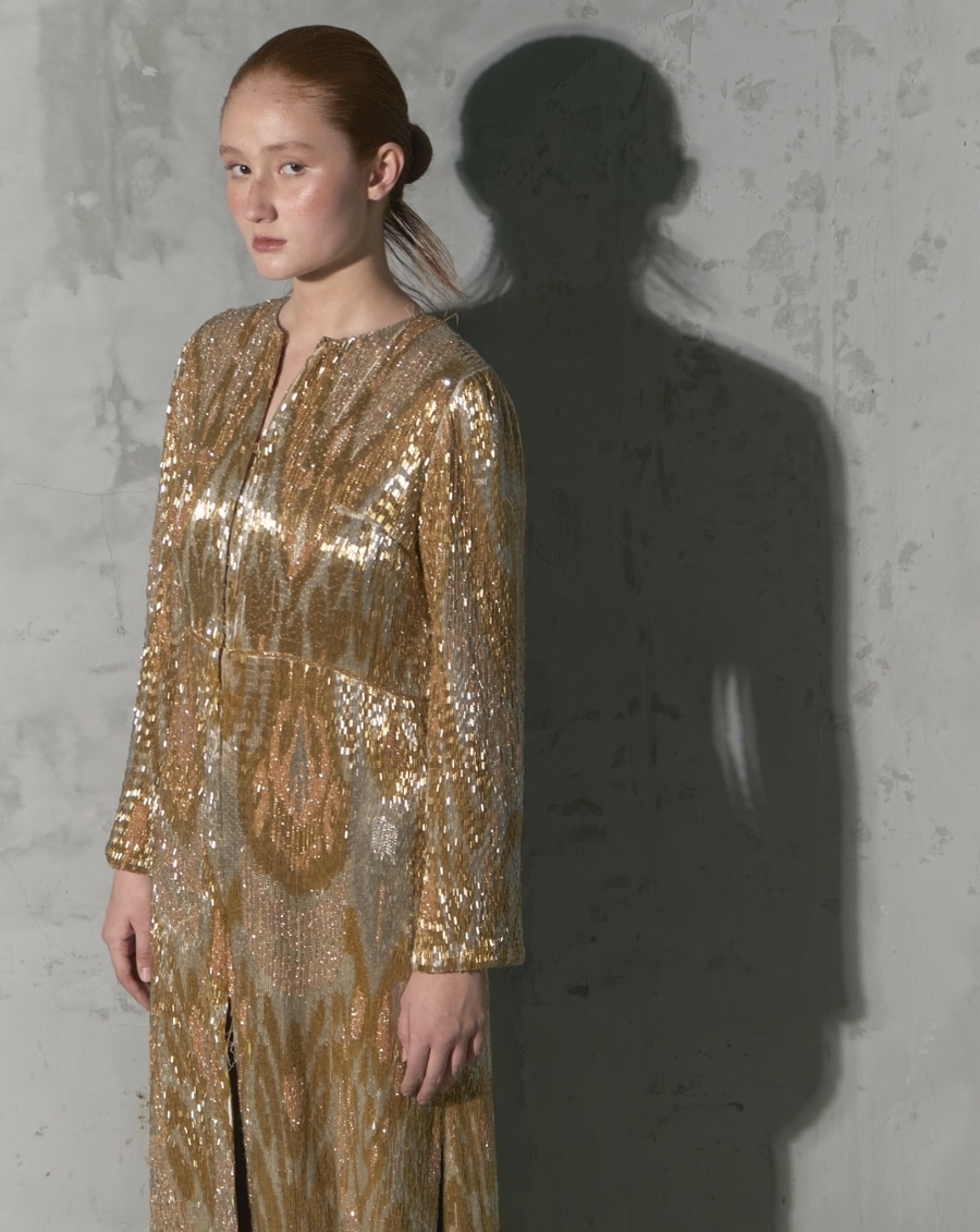 Длинный жен чапан в традиционном стиле икат, полностью расшитый золотистым биссером. Работа Дильнозы Умирзаковой — основателя бренда AnorCouture