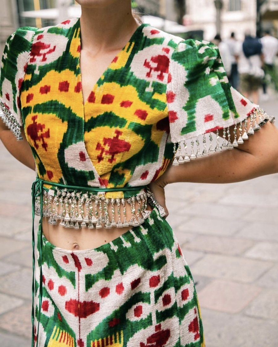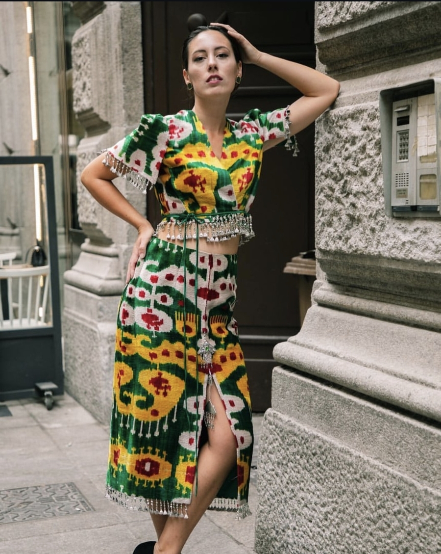 Удлиненная юбка с разрезом спереди и топ из ткани с традиционными узорами. Работа Дильнозы Умирзаковой — основателя бренда AnorCouture