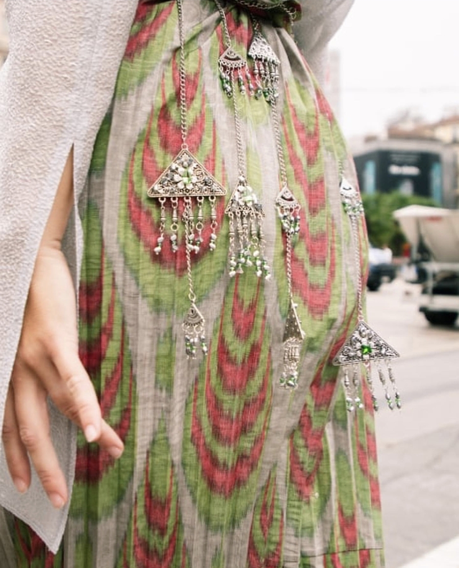 Плиссированная юбка из шелка с традиционными узорами, украшенная подвесками в форме традиционного оберега от сглаза. Работа Дильнозы Умирзаковой — основателя бренда AnorCouture