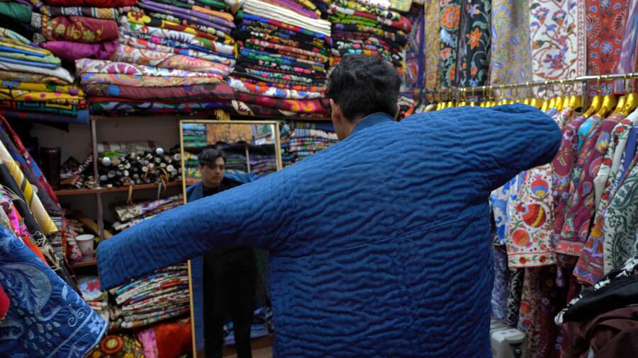 Льняные куртки из хлопка ручной работы. Пальто с открытым передом, вдохновлённое искусством иката. Работа Мирана Халикова — ремесленника из Бухары