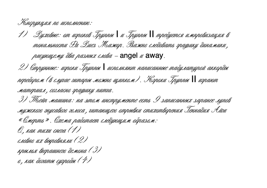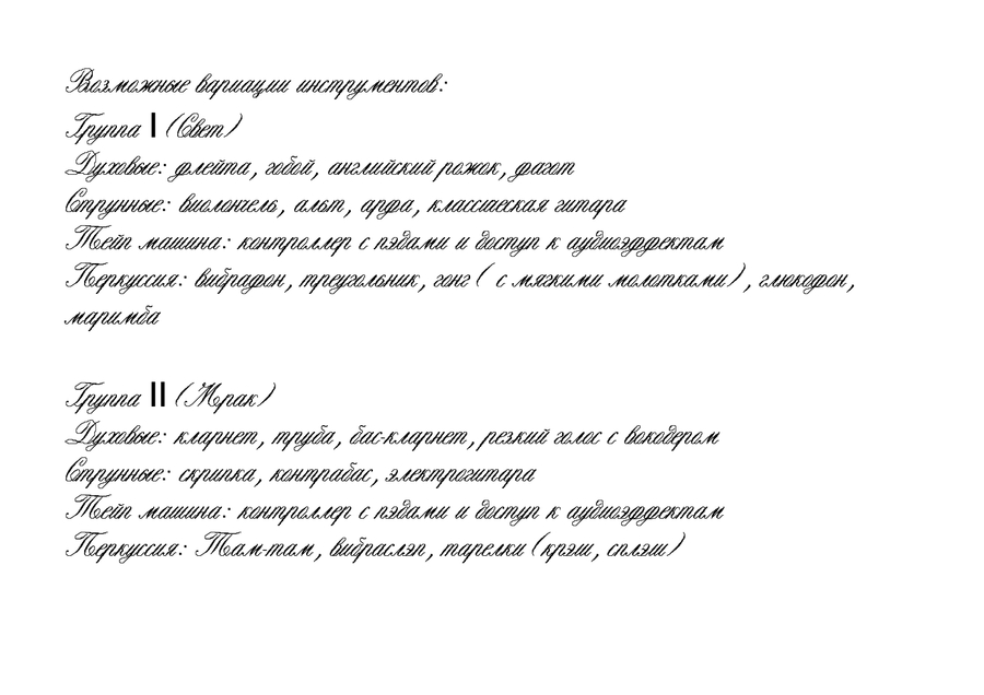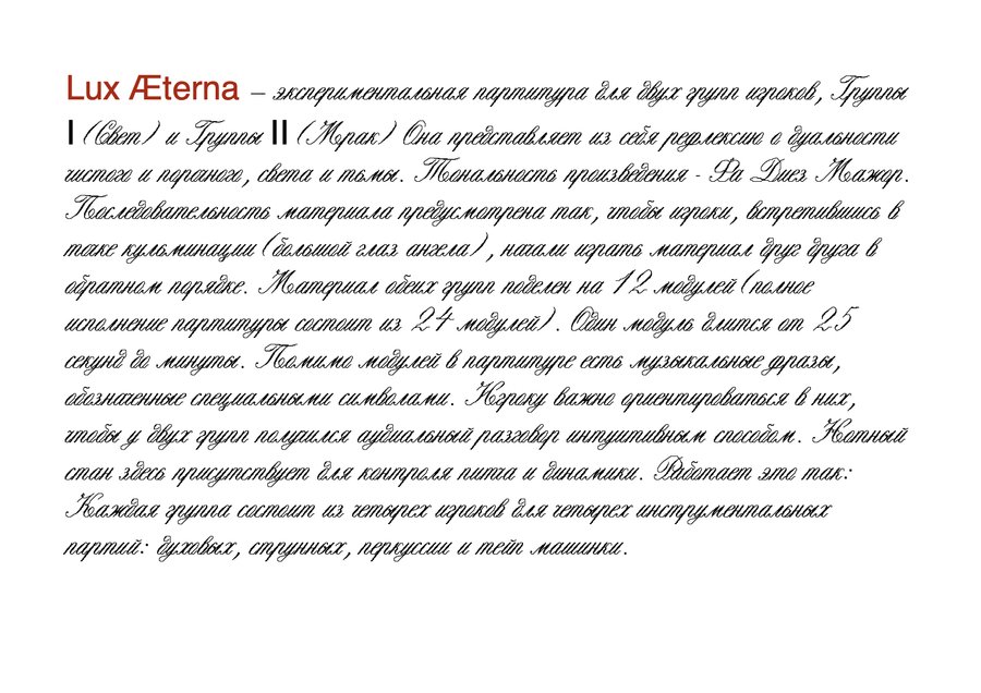Lux Æterna — экспериментальная партитура для двух групп игроков, Группы I (Свет) и Группы II (Мрак). Она представляет из себя рефлексию о дуальности чистого и порочного, света и тьмы.