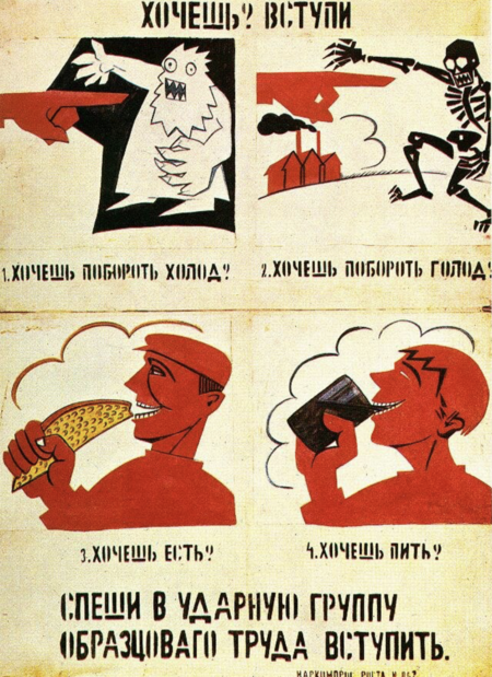 При советской власти такие плакаты не только стали расцениваться как откровенная пропаганда, но и включали в себя некоторые фрагменты из реальных произведений живописи и графики, а со временем количество таких элементов только увеличивалось. К созданию плаката были привлечены самы художники. Они приложили немало усилий, чтобы плакат получился четким и лаконичным.