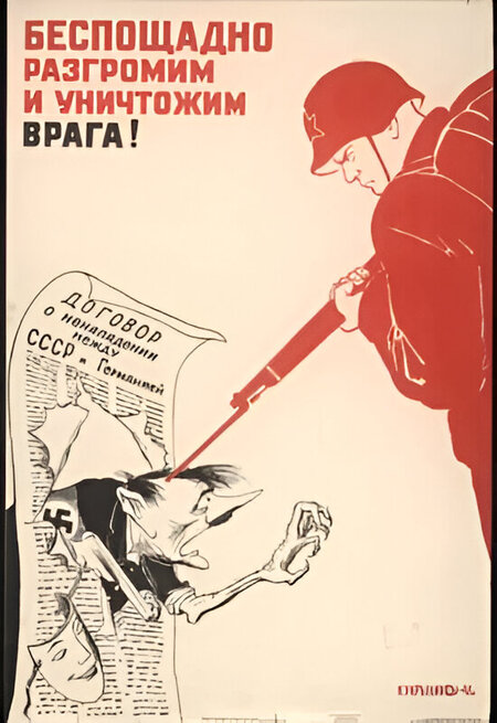 Плакат «Беспощадно разгромим и уничтожим врага!» был одним из первых, который граждане Советского Союза увидели в начале Великой Отечественной войны. В мультяшном стиле он демонстрировал неискренность Гитлера и нарушение договора о ненападении между СССР и Германией. На изображении солдаты Красной Армии сорвали маску с лица Гитлера, выявив его истинное лицо, и уничтожили опасного врага. Этот плакат служил символом решимости советского народа в борьбе против нацизма и фашизма.