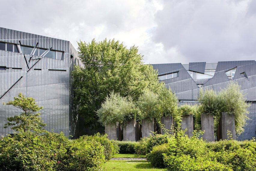 Выполненное в стиле деконструктивизма зигзагообразное здание с фасадом, облицованным титаном и цинком, сильно контрастирует со старым зданием дома Коллегий. По словам архитектора Даниэля Либескинда дизайн-проект «Between the Lines» был вдохновлен несколькими вещами: мемориальными книгами с указанием бесчисленных имен и фамилий жертв нацистского преследования, оглушающей тишиной в конце незаконченной оперы композитора Арнольда Шенберга «Моисей и Аарон», эссе Вальтера Беньямина «Улица с односторонним движением» и матрицей, получившейся из пересечения на карте города адресов выдающихся берлинцев, выступавших за связь еврейских традиций и немецкой культурой (Пауль Целан, Макс Либерман, Генрих фон Кляйст, Рахель Варнхаген и Фридрих Гегель и сотни других).