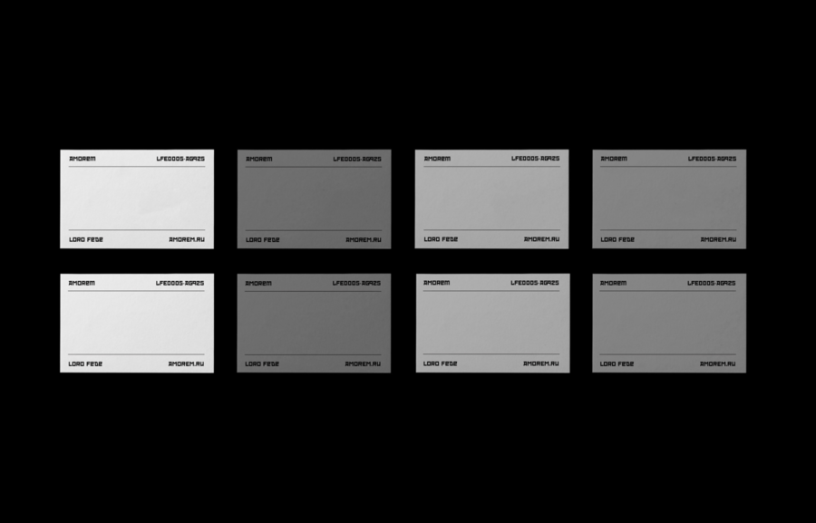 The image shows eight identical business cards arranged in two rows of four, each card occupying its own square on a black background. The top row features three white cards and one light gray card, while the bottom row mirrors this pattern but with slightly darker shades. Each card has a minimalist design with the text 'AMOREM' in uppercase letters at the top left corner, followed by 'LFE00S-RG25' in a smaller font below it. At the bottom right corner of each card, there is additional text reading 'LORD FEDE' and 'AMOREM.RU'. The cards are evenly spaced and perfectly centered within their respective squares, creating a symmetrical grid layout. The lighting is even and soft, highlighting the texture of the cards without casting harsh shadows. This monochromatic composition emphasizes the professional nature of the cards, with high contrast between the white or light gray cards and the dark background.