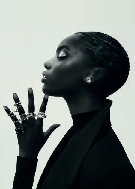 A minimalistic monochrome photo of a happy girl in a leather raincoat wearing an AMOREM jewelry brand ring. The ring has a large stone with the inscription «AMOREM» in capital letters. The background