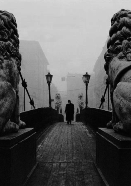 На фотографии «Львы» Бориса Кудрякова силуэт мужчины, застывший в центре композиции между двумя львами на мосту, становится частью жёсткой архитектурной симметрии. Чёрный силуэт сливается с конструкцией моста и рифмуется с вертикальными направляющими фонарей, создавая визуальный ритм подчинения.