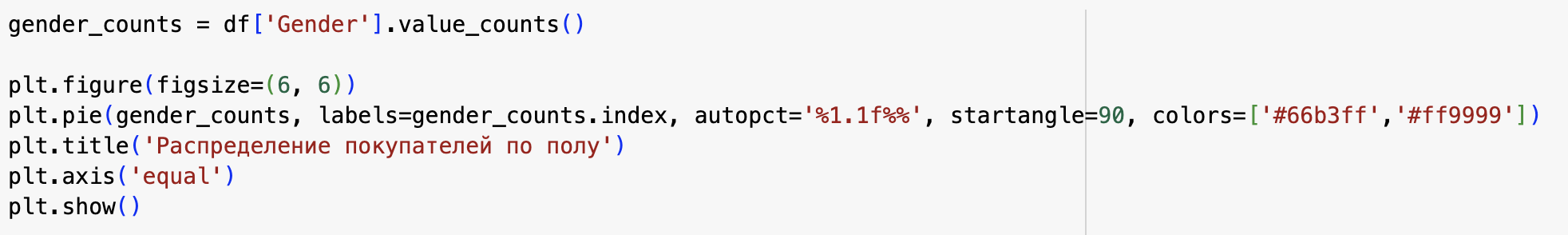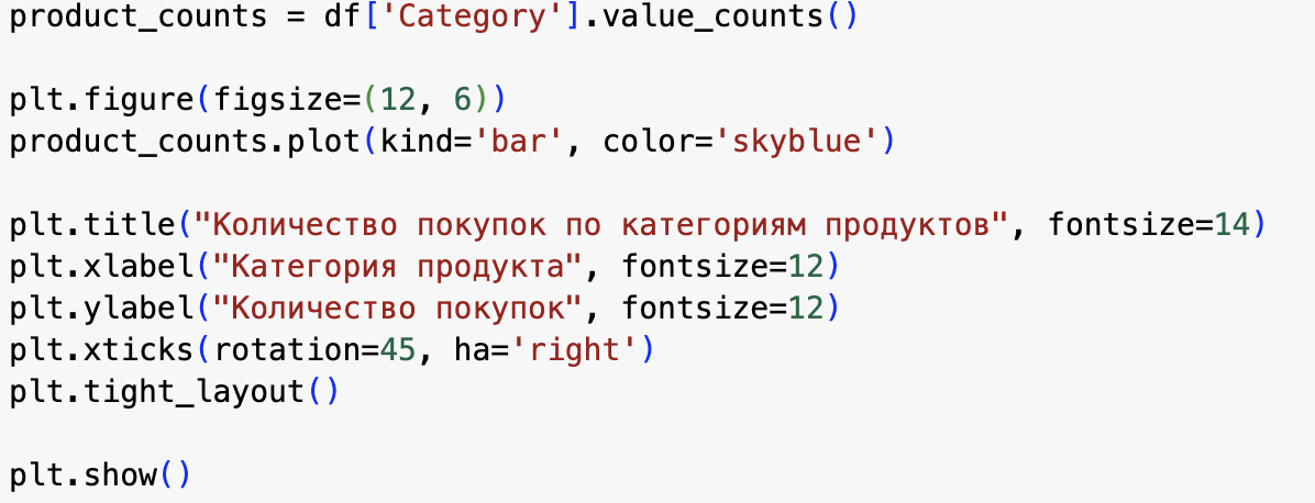 1. Гистограмма: для отображения количества покупок по категориям продуктов. 2. Круговая диаграмма: для распределения покупок по полу. 3. Диаграмма рассеяния: чтобы определить зависимость возраста покупателя от суммы покупки. 4. Тепловая карта:. 5.
