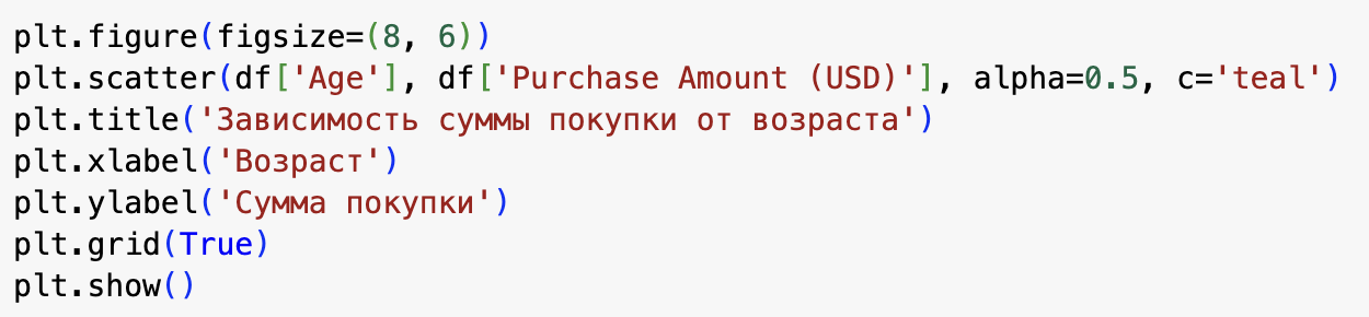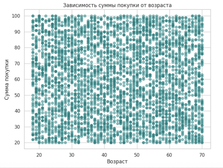 При определении зависимости суммы покупки от возраста оказалось, что определенной зависимости не наблюдается.