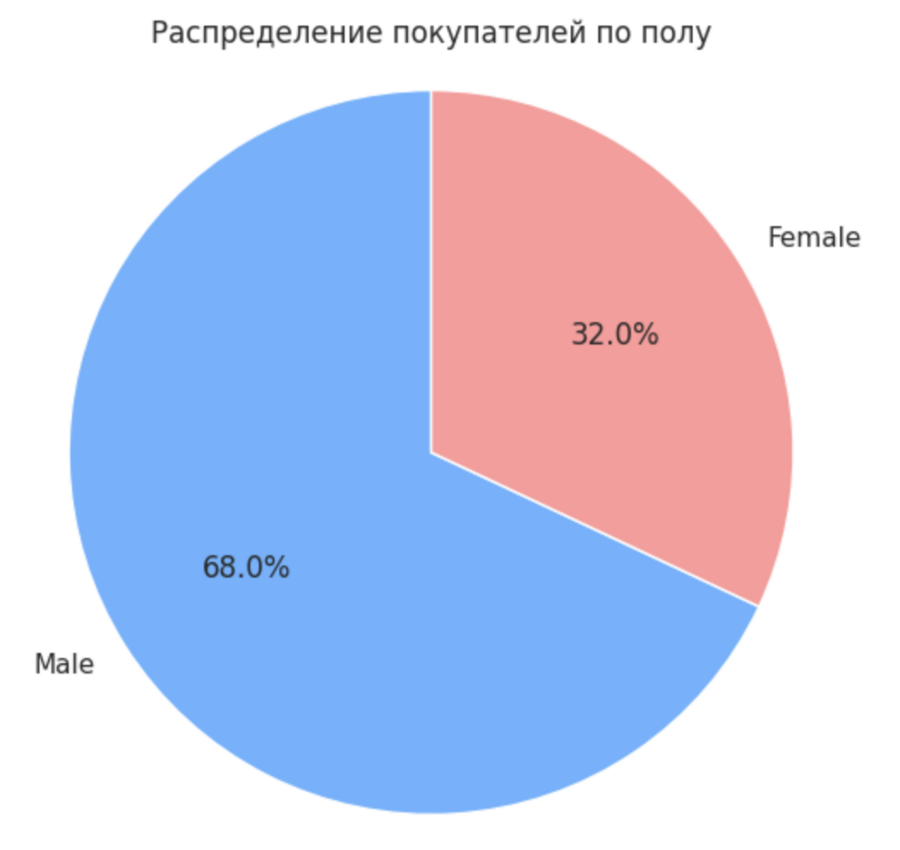 На удивление, большее количество покупок из данных были сделаны мужчинами. Мужчин 68%, женщин 32%