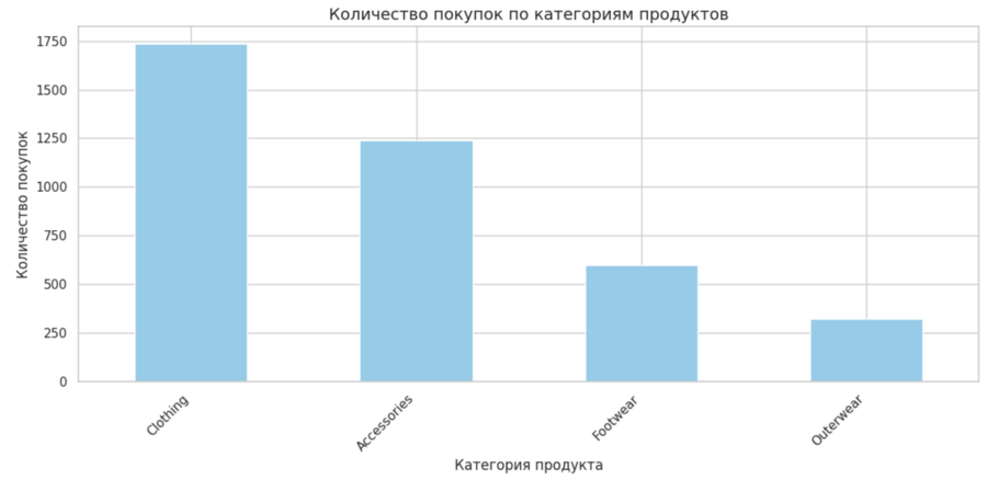 По графику видно, что большинство покупок сделаны в категории «одежда» и это почти 1750 покупок. Вторая по количеству это категория «аксессуары». Меньше всего люди покупают в категории «верхняя одежда».