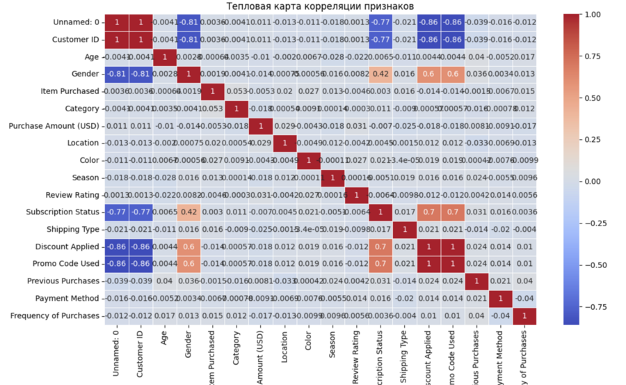Gender и некоторые другие параметры имеют низкую или почти нулевую корреляцию, что подтверждает гендерную нейтральность покупательского поведения в рассматриваемом датасете.