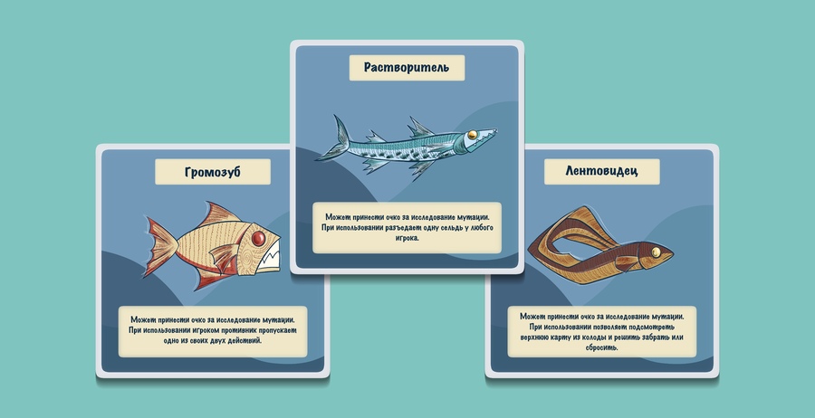 1. Растворитель — при использовании разъедает сельдь у любого игрока; 2. Громозуб — при использовании выбранный игроком противник пропускает одно из своих двух действий; 3. Лентовидец — при использовании можно подсмотреть верхнюю карту рыбы из колоды и решить забрать или сбросить.