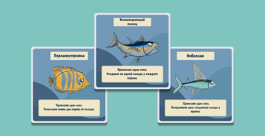 1. Перламутровка позволяет взять 2 карты из колоды; 2. Небоплав воскрешает съеденную рыбу в трюме; 3. Всепожирающий тунец атакует всех игроков и съесть у каждого по 1 рыбе.