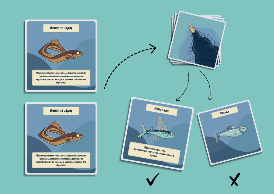 В конце игры пара мутировавших рыб приносит 1 очко за исследование мутации. Если у игрока нечетное количество карт мутировавшей рыбы, то лишняя рыба не считается.