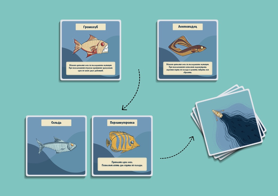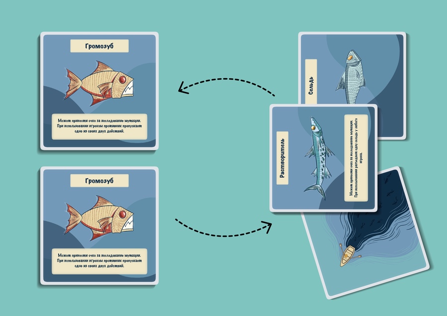 1. Растворитель и громозуб атакуют любого противника. При атаке карта рыбы соперника не переворачивается, а уходит в сброс; 2. Растворитель и лентовидец позволяют забрать 1 карту рыбы у соперника; 3. Громозуб и лентовидец могут заставить сбросить последнюю карту рыбы у любого противника.