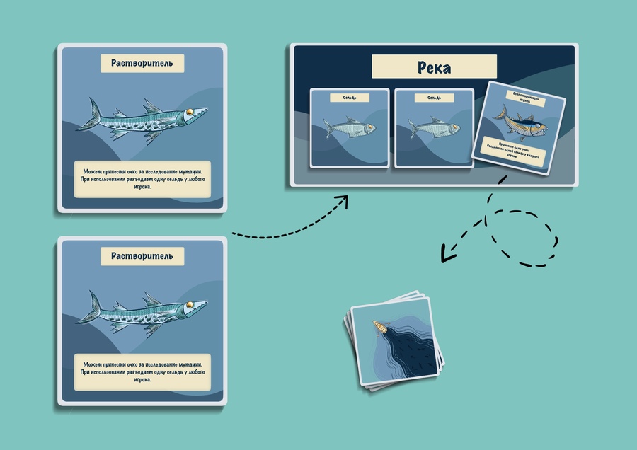 1. Пара растворителей в начале своего хода может разъесть любую карту рыбы в открытой реке, чтобы она не досталась соперникам; 2. При паре громозубов игрок атакующий тебя получает обратный удар и теряет 1 действие на следующий свой ход; 3. Пара лентовидцев позволяет подсмотреть 2 карты из колоды и выбрать одну.