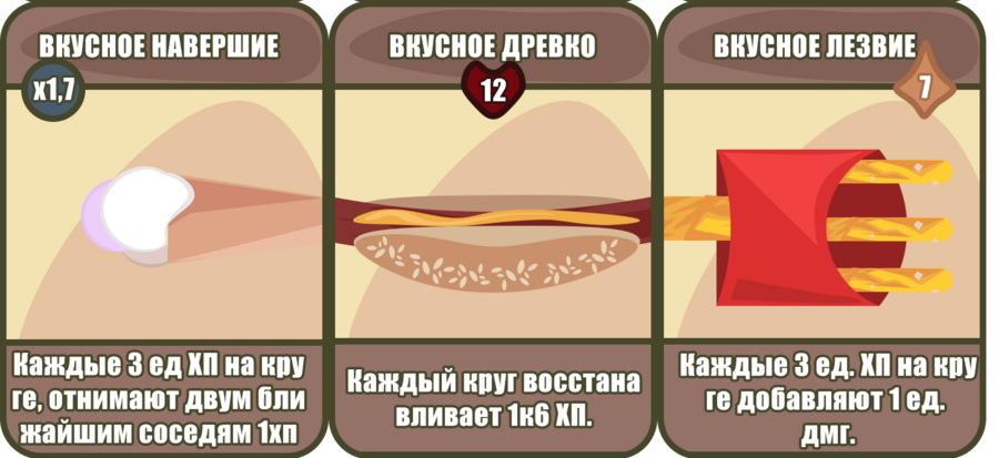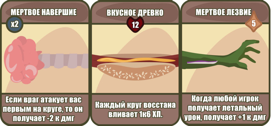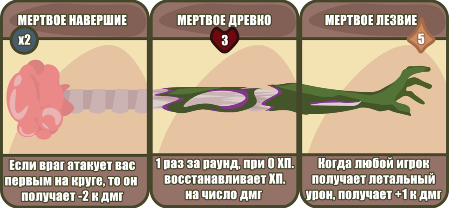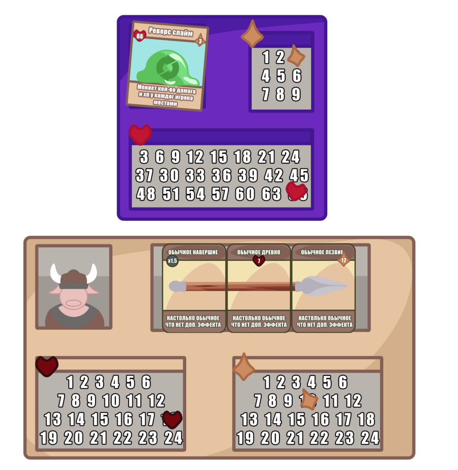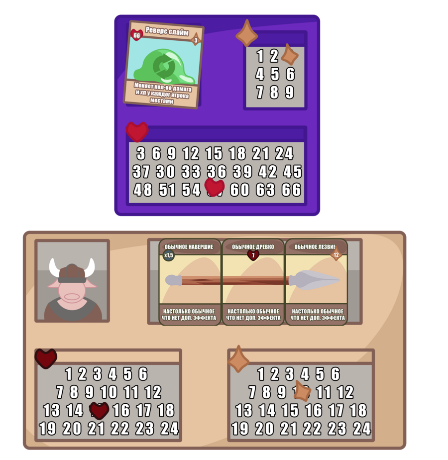 Не забудьте положить фишку, на кол-во урона и хп! Следующим — разыгрывается карта врага, и кладется на лист врага