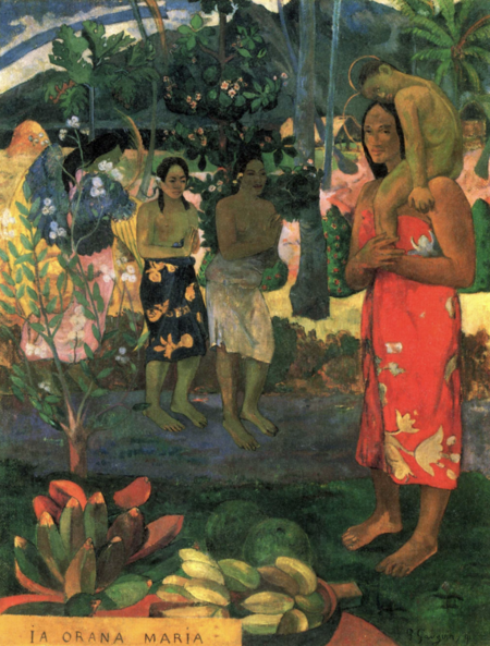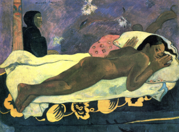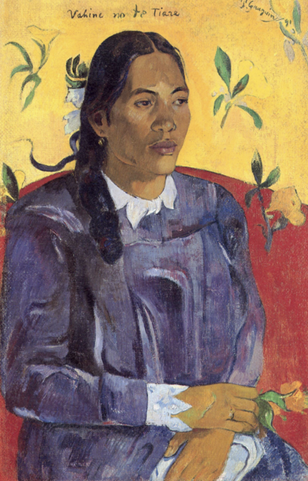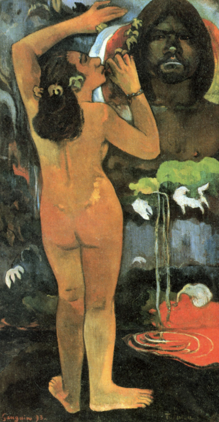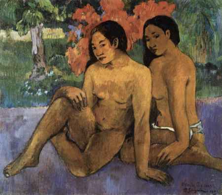 В своих самых известных таитянских полотнах Гоген использует очень яркие, зачастую неестественные цвета. На картинах изображены полуобнаженные таитянки в окружении хижин и пейзажей тропиков, нередко героиней полотен является его жена.