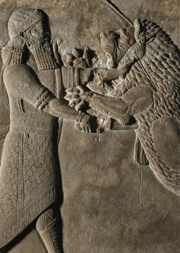 Взаимодействие царя с богом можно увидеть и на этом рельефе. По двум сторонам стоят крылатые жрецы, где крылья подчеркивают их божественную силу. Второй человек слева- это ассирийский царь, которого выдают те же браслеты на запястье и локте. В центре рельефа изображен ассирийский бог Ашшур — бог войны, покровитель охоты и скотоводства. Ашшур часто изображался внутри силуэта птицы (крылья и хвост).