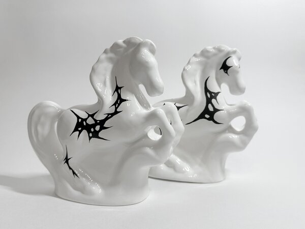 [pair of porcelain unicorn figurines with tribal ornaments, manes flowing, realistic 3D look, glossy porcelain]