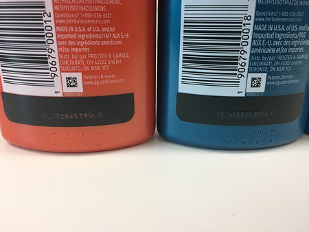 Печать на бутылочках шампуня и кондиционера Herbal Essences, чтобы слепые люди могли отличить, в какой из емкостей находится шампунь, а в какой — кондиционер.
