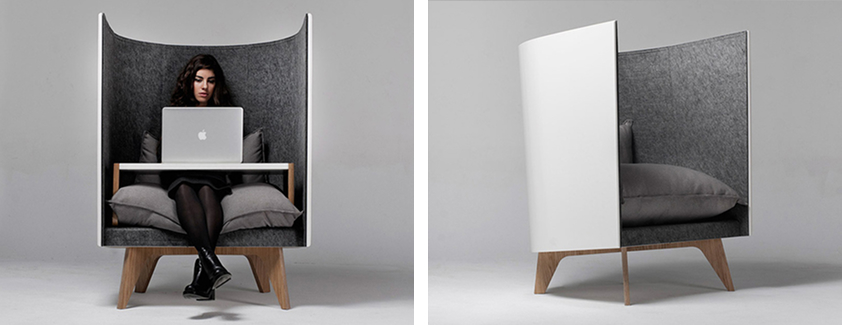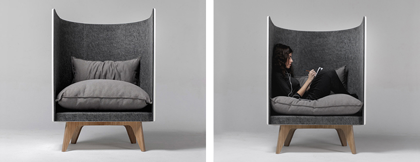«HUSH» — трансформируемое кресло-укрытие из войлока, которое может раскрываться или полностью сворачиваться вокруг пользователя. Внутри создаётся приглушённый, мягкий по акустике объём, напоминающий небольшую личную комнату. Сравнение с закрытым гнездом уместно в том, как войлочная оболочка формирует стабильную, тёплую внутреннюю среду и визуально защищает тело. Это дизайн, в котором приватность достигается не конструкциями, а мягкой, адаптивной оболочкой.