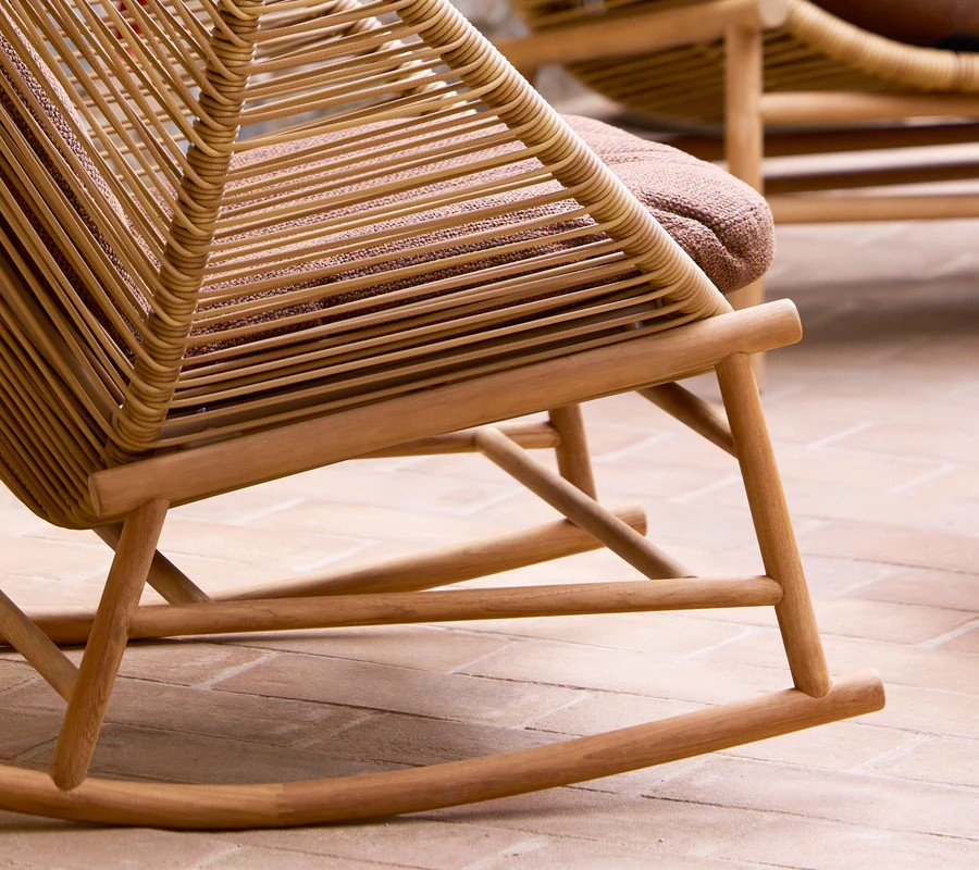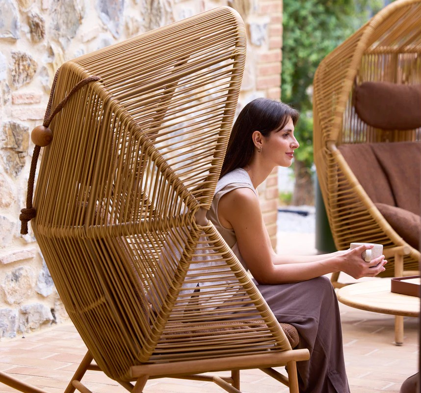 «Hive Schommelstoel» — кресло-качалка с плетёной структурой, которая формирует полузакрытый объём вокруг сидящего. Органичные линии и плавное покачивание создают ощущение естественного уединения и мягкого ритма. Тиковое основание и устойчивый плетёный материал делают кресло подходящим для долгого использования на открытом воздухе.