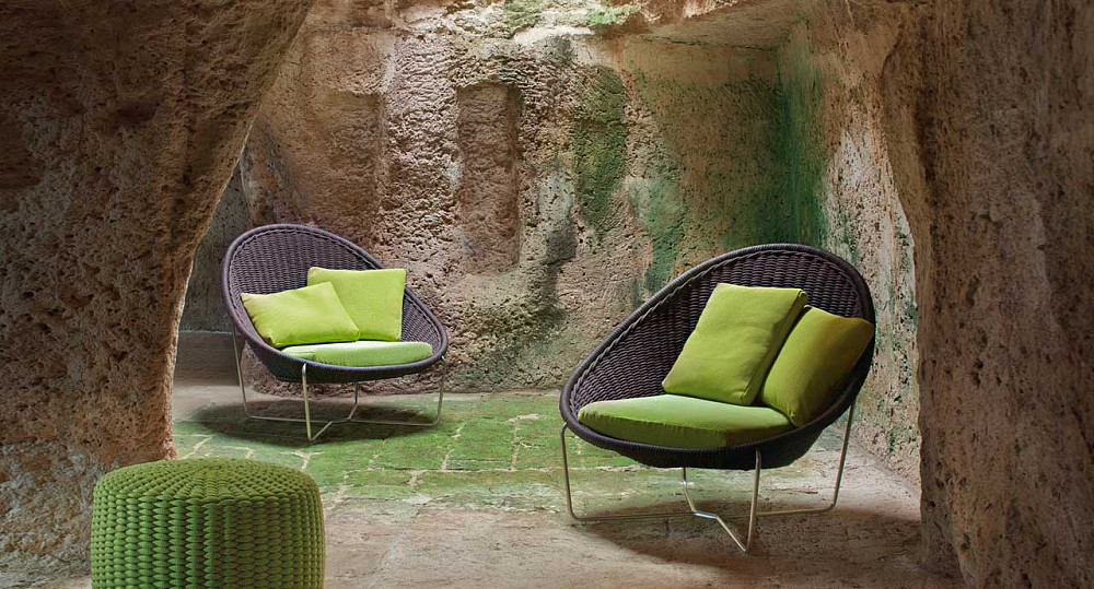 Название «Nido» не случайно — коллекция кресел и пуфов буквально имитирует структуру гнезда через свою фирменную тесьму. Визуально это выражается в переплетении, создающем пористую, но обволакивающую форму. Такая фактура вызывает ассоциации с природными волокнами и плетениями, как в гнездах птиц. Кресло обеспечивает мягкое, полузакрытое пространство, которое обнимает сидящего, создавая ощущение уюта и защищенности.