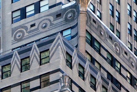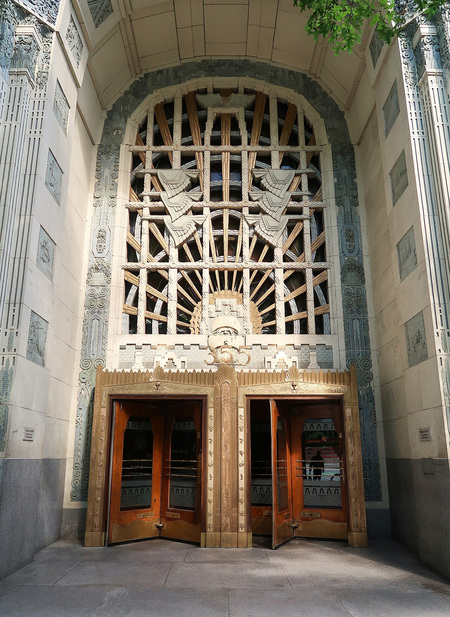 Оригинальные интерьеры Эмпайр-стейт-билдинг не сохранились, но реставраторы, опираясь на исторические фотографии и чертежи, максимально точно восстановили атмосферу ар-деко 1930-х годов. Так, можно рассмотреть лифтовую зону, где хорошо показан символ солнца, который в ар-деко выражает расцвет новой эпохи, идею энергии и прогресса. Такой образ очень подходит для лифтовой зоны, поскольку лифт — синоним динамики.