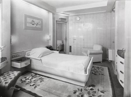 Интерьеры кают лайнера демонстрируют сочетание роскоши и современности. Редкие породы дерева соприкасаются с геометричными формами и встроенной мебелью. Все это подчеркивает гармонию между утонченностью и функциональностью. Так, плавные линии на потолке и в отделке кроватей относятся к идее аэродинамики и движения, однако общая композиция, особенно на второй фотографии, создает ритм пространства, что также характерно для классики.