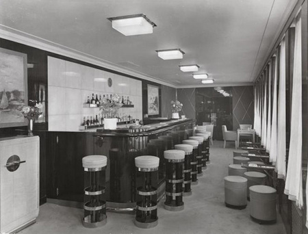 На первой фотографии можно заметить чистоту линий, утонченность, характерную для классики. Металлические элементы и встроенная мебель же относят нас к техническому прогрессу. Интересным мне также кажется потолок, своими формами показывающий всю уникальность ар-деко. Глянцевые поверхности, хромированные акценты и строгая геометрия барных стоек на второй фотографии создают ощущение динамики и технического совершенства, которое удачно уравновешено традиционной симметрией, картинами и спокойным ритмом интерьера.