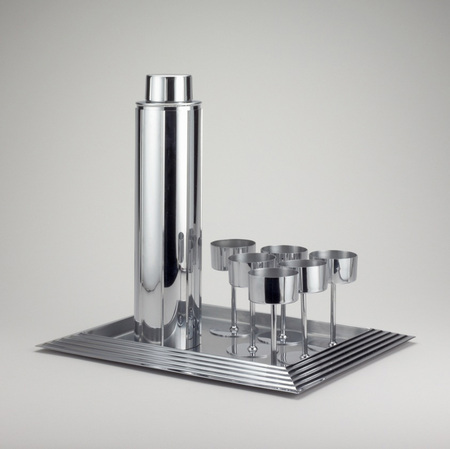 Шейкер «Небоскреб» прекрасно демонстрирует стремление ар-деко превратить повседневный предмет в выраженный символ эпохи. В данном случае можно увидеть символ роста (вертикальные линии самого шейкера так и просятся вверх). Ступенчатая форма подноса демонстрирует ярусность и подъем вверх. Использование металла здесь тоже не случайно, поскольку материал усиливает все эти ассоциации, делая объект единым и схожим с архитектурой стиля ар-деко. Мне вообще кажется удивительным, что дизайнер заметил подобный ассоциативный образ в таком повседневном предмете. Это хорошо отражает, как мышление человека было «настроено» на технический прогресс.