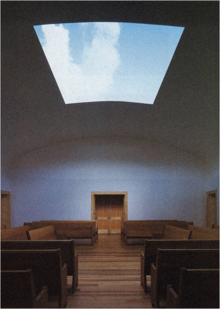 Джеймс Тарелл убирает традиционный купол из молитвенного дома — вместо него он делает отверстие в крыше, через которое видно небо. Центром этого пространства становится небо, которое обычно не видно в замкнутых пространствах.
