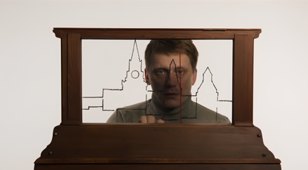 Это, например, статьи о «Полине Революции», раскрывающие её как героиню своего времени, которые мы видим вместе с её спокойным, уверенным лицом. Или композитор-авангардист, с упоением и активном жестикуляцией рассказывающий о музыке революции, и прямо на нём мы видим видеоряд к его музыке.